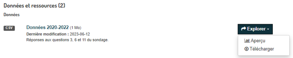 Dans un jeu de données, cliquez sur le bouton « Explorer » se trouvant à droite d’une ressource. Sélectionnez ensuite l’option « Aperçu » qui apparaît dans le menu déroulant. Si l’option n’apparaît pas, c’est qu’il n’y a pas d’aperçu disponible pour cette ressource.